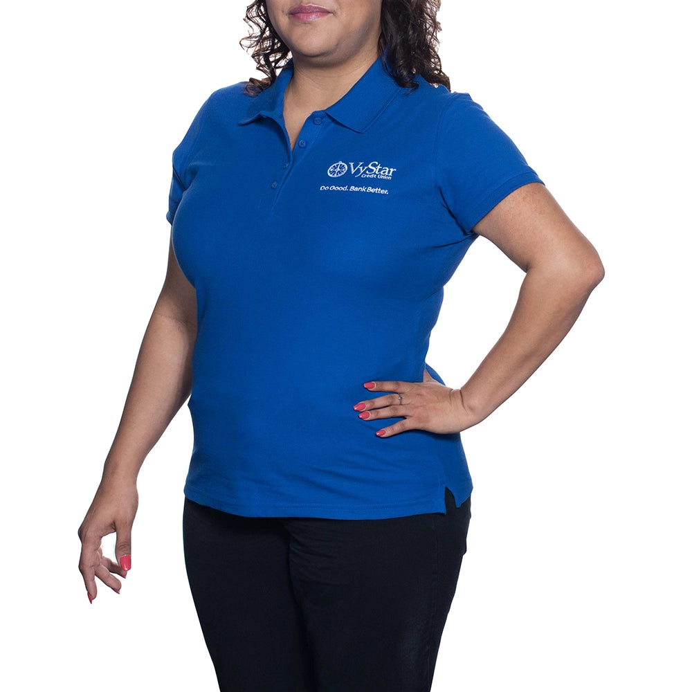 Ladies Port Authority Pique Polo in Royal Blue. The polo is a 60/40 cotton/poly pique with a Flat knit collar and cuffs and 4-button placket with dyed-to-match buttons. The VyStar Credit Union Do Good. Bank Better. Logo is embroidered on front Left chest in white.